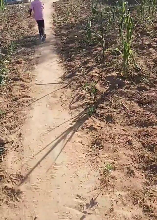 A person in a pink shirt and dark shorts is walking on a dirt path. The path is between two plots of land, one containing scattered green vegetation and the other featuring taller, linear plants. The shadow of what appears to be a utility pole or thin tree stretches across the path. A single-story building with a light-colored exterior and blue window frames is visible to the left. The ground is dry and the overall scene appears to be taken in a rural setting during the daytime.