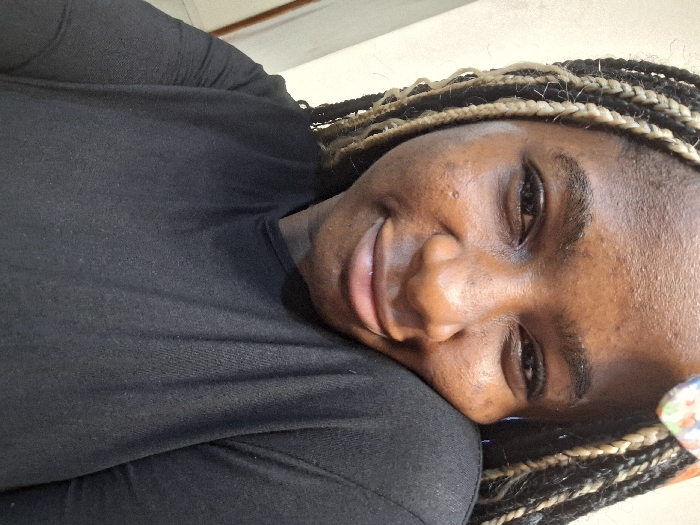 A dark-skinned woman with braided hair, some strands blonde, is visible. She is wearing a black long-sleeved shirt. The woman is smiling softly, with her face turned slightly towards the camera. The background is a muted white or off-white, suggesting an indoor setting. The photo's angle is slightly tilted, giving a casual and relaxed feel.