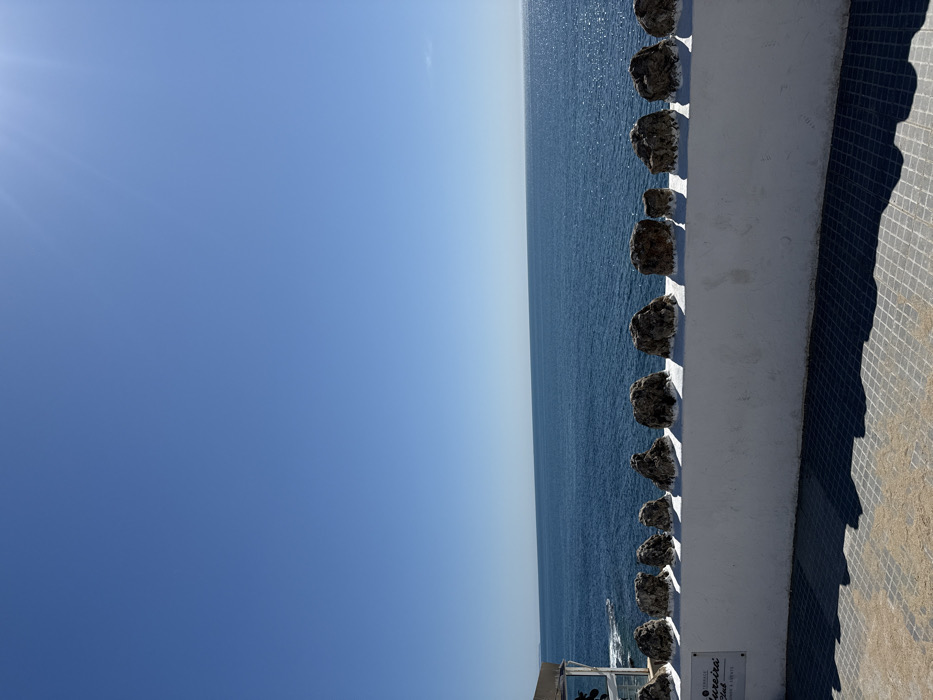 The image captures a panoramic coastal view in Cascais, Portugal, specifically from the vantage point of the Terraço Mareira Club, overlooking the Atlantic Ocean. The scene is illuminated by intense sunlight under a clear, cloudless blue sky, which dominates the upper two-thirds of the frame. A low, white-painted masonry wall extends horizontally across the lower third of the image, functioning as a foreground barrier. The top of this wall is adorned with a series of approximately eleven dark, irregularly shaped rock formations, evenly spaced. A white rectangular plaque is affixed to the wall on the left, partially obscured but clearly displaying "Terraço Mareira Club" and "Restaurante & Lounge." The ground immediately in front of the wall consists of light-colored square paving tiles, upon which distinct, elongated shadows are cast to the left by the wall and its rocky embellishments, indicating the sun's position high and to the right. Beyond the white wall, the deep blue Atlantic Ocean stretches to the horizon, its surface appearing calm. A path of shimmering sunlight is visible on the water's surface, extending towards the right side of the frame. To the far left, a portion of a modern building structure, likely part of the restaurant, is visible. It features a flat overhang and glass-paneled railings, suggesting an outdoor terrace built into or on the rocky coastline. No individuals or specific activities are present within the scene.