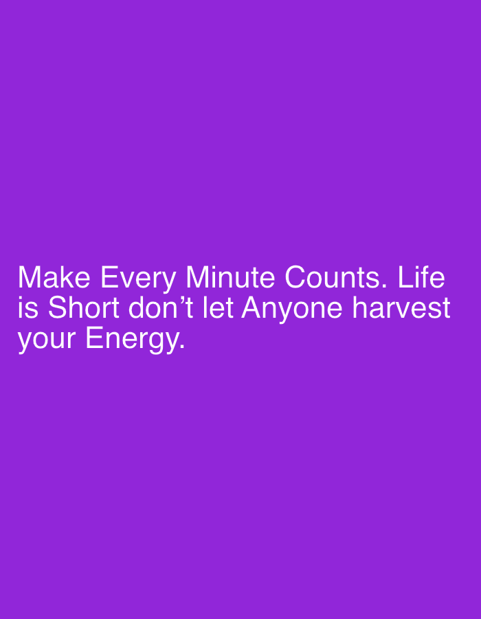 The image is a solid purple background with the white text "Make Every Minute Counts. Life is Short don't let Anyone harvest your Energy." The image is not associated with any location, people, objects, or actions. It is a simple text graphic.