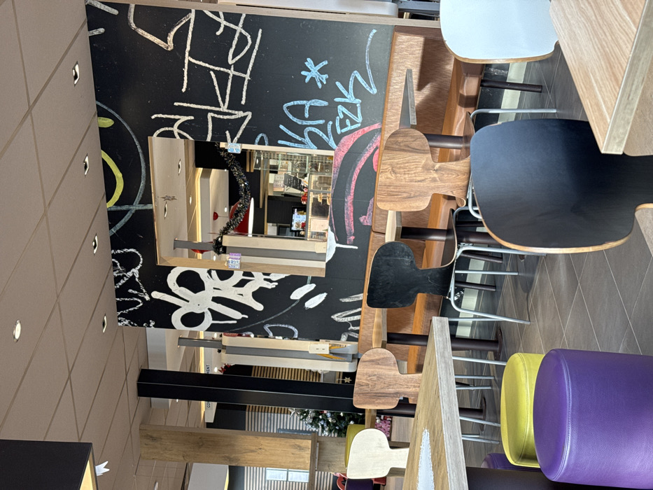The image displays the interior of a dining establishment located in Oberhausbergen, France. No individuals are present in the scene. In the immediate foreground, a light wooden table with a visible white placemat or runner partially obscures a purple circular ottoman on the left and a lime green circular ottoman positioned further back. The floor is composed of light grey square tiles. The central and right background features a prominent black wall adorned with white, light blue, and yellow graffiti-style markings. This wall contains a rectangular opening, framed by light-colored wood, through which a brightly lit service counter with display cases and a red pendant light fixture are visible. A dark Christmas garland, decorated with small, multi-colored gift-box ornaments, hangs across this opening. Along the base of the black wall and extending towards the left, a continuous brown upholstered booth seating arrangement is present. Paired with this seating are light wooden tables supported by dark metal bases. Various chairs with distinct 'P'-shaped or rounded-square backs, in both black and natural wood finishes, are positioned around these tables; a white chair back is partially visible on the far right. Structural elements include a dark, rectangular pillar in the mid-ground left and several light wooden vertical panels framing sections of the black wall. In the background on the far left, behind a wooden pillar, a small, illuminated Christmas tree is visible. The ceiling is a light-colored suspended grid with recessed lighting fixtures.