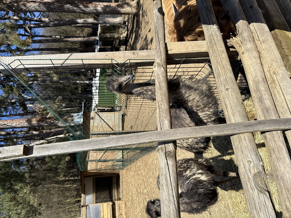 This image depicts an outdoor animal enclosure situated in the city of Leskovets, Bulgaria, under bright daylight. A rustic wooden fence, consisting of three horizontal logs and a vertical post, occupies the immediate foreground. Behind this fence, two emus are visible on a ground of packed earth mixed with scattered dry hay. The emu on the left stands with its dark-feathered body partially obscured by the fence and post, its head turned slightly to the right. Another emu stands further back and to the left, with its head and upper body visible above the hay. In the mid-ground, a green metal mesh fence divides the primary enclosure from secondary areas, which contain small wooden shelter structures. A third emu's head is visible through this metal mesh fence in the mid-right portion of the image. On the far right, behind the foreground wooden fence, the shaggy, light-brown head and shoulders of a bovine animal, consistent with a Highland cow, are partially discernible. The background features a dense forest composed primarily of tall pine trees, set against a clear blue sky, with visible shadows indicating strong direct sunlight.
