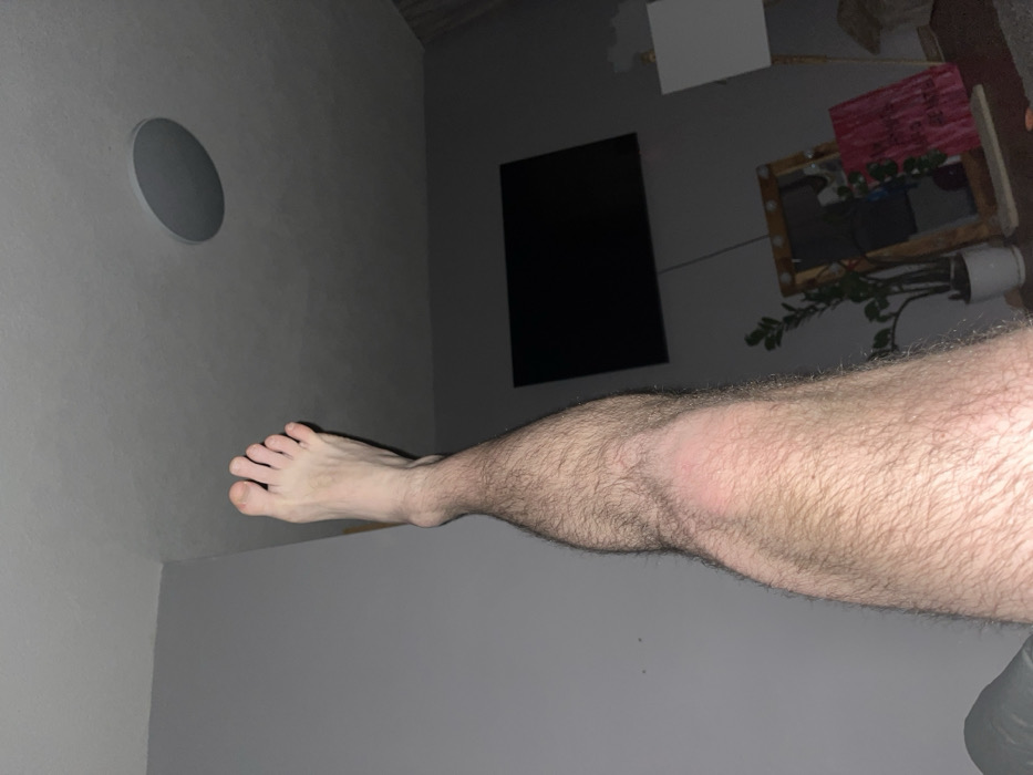 A sideways view captures a leg from foot to thigh. The foot is pale with slightly spread toes, while the leg is covered in dark hair. A reddish patch appears near the knee. The background features gray walls, a round speaker on the left, a dark rectangular shape resembling a TV in the center, and a picture frame with a plant on the right. The lighting is dim.