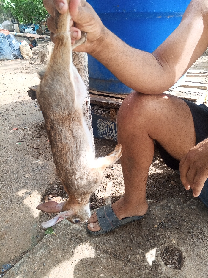 A person holds a dead rabbit hanging upside down. The individual, wearing a single blue sandal, is seated on a concrete surface, with a blue barrel in the background. The rabbit's fur is a mix of brown and gray, and its ears are floppy. Bags and foliage are visible in the background. The person's other leg and part of their hand are visible.