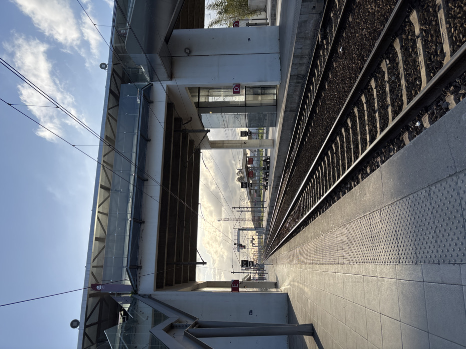This image depicts a modern train station in Kenitra, Morocco, viewed from a platform looking down the tracks. In the foreground, a concrete platform with light grey tiles and a tactile paving strip runs parallel to two sets of railway tracks filled with dark ballast and wooden sleepers. Overhead, a complex network of catenary wires for electric trains is visible. To the left, a substantial concrete pillar supports an elevated structure, featuring glass railings and a metal roof canopy. A red square sign with the letter "E" is affixed to this pillar. Further down the tracks on the same side, signal gantries and additional station infrastructure are visible under a partly cloudy sky, indicating either early morning or late afternoon due to the sun's low angle and long shadows. On the right side of the image, another concrete platform parallels the tracks. This platform features a modern building with a glass elevator shaft integrated into a large concrete support column, marked with a red square "D" sign. Further along this platform, beyond the elevated structure, benches are visible under a shelter. The elevated structure itself forms a pedestrian bridge or concourse spanning over the tracks, constructed with concrete beams, metal framework, and glass panels, allowing natural light through. Beyond the station infrastructure, indistinct buildings and what appears to be a communication tower are visible against the horizon. No individuals are present in the scene.