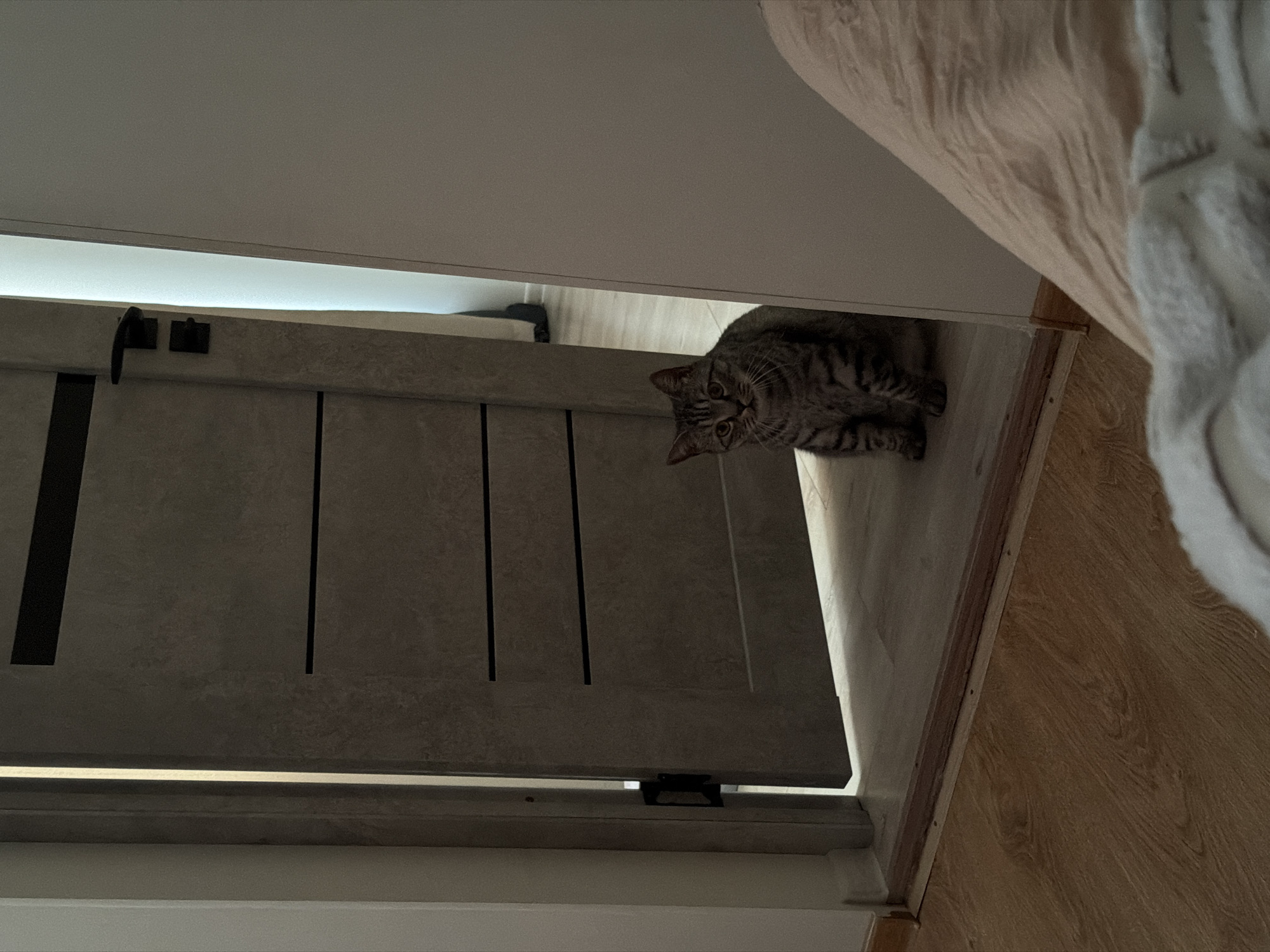 A gray tabby cat is sitting on a wooden floor, partially obscured by a gray door