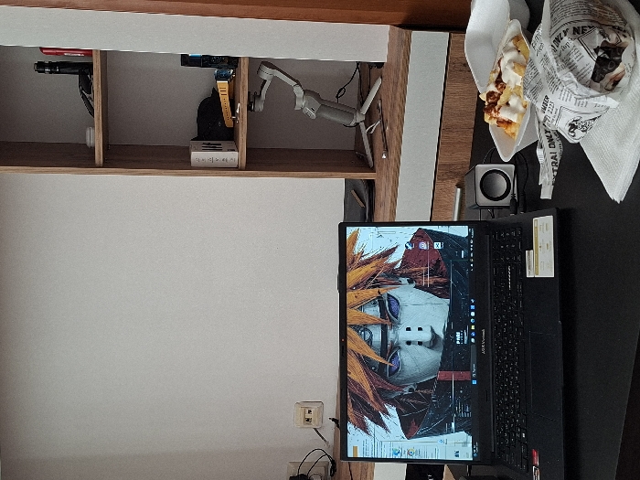 The image displays an indoor scene, likely a workspace or room in Sofia, Bulgaria. No individuals are visible. A black ASUS Vivobook laptop occupies the left foreground on a dark, flat surface, presumably a desk. Its screen displays a wallpaper of the anime character Pain from Naruto, with the Windows 11 taskbar visible at the bottom. To the immediate right of the laptop is a small, rectangular silver and black speaker. Further to the right on the desk, a white styrofoam container holds a serving of french fries topped with white sauce and red seasoning. Next to this container, a food item, likely a kebab or gyros, is tightly wrapped in paper printed with a newspaper pattern. The visible text on the wrapper includes "Dnevnik," a Bulgarian newspaper, and a partial phone number "223 2223" on a small receipt fragment, indicating the location as Sofia, Bulgaria. The wrapped food rests on a white folded napkin. The background consists of a plain, light-colored wall on the left, featuring a two-socket electrical outlet. To the right, a wooden shelving unit is visible. The top shelf contains a black vaping device (mod and atomizer), a red item, and keys. The middle shelf holds a white box, a black fabric item, a yellow object, and a blue bottle. The bottom shelf displays a gray DJI Osmo Mobile gimbal resting on its tripod. The overall arrangement suggests a user is taking a break to eat while working or engaging with the laptop.