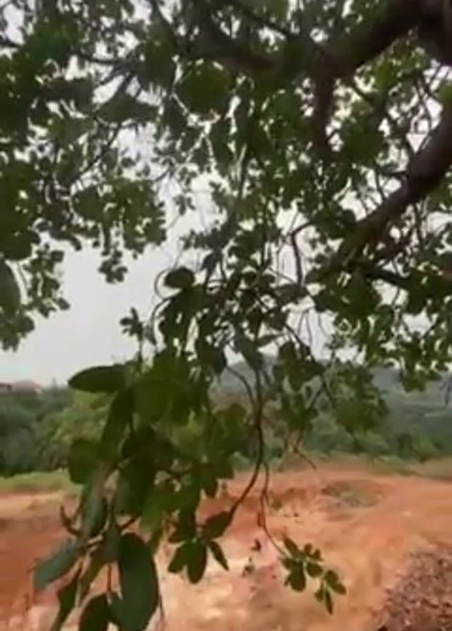 The video begins with a view through the branches of a large, leafy tree, looking down on a construction site