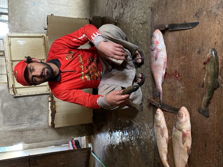In a facility located in the city of Deh Sabzi, Afghanistan, a male individual is depicted crouching on a wet, concrete floor. The man has dark hair, a beard, and a mustache. He is wearing a red long-sleeved shirt with a black collar, white sleeve accents, and a graphic featuring skewers/kabobs with "افغان کباب شرکت" (Afghan Kabob Company) text. He also wears light brown trousers and dark open-toed sandals. The man holds a dark-colored fish in his left hand and looks directly at the camera. In front of him, on a stained wooden surface, are four additional fish and two knives. Two light-colored, scaled fish are positioned horizontally on the left side of the wooden surface. To their right, a larger reddish-pink fish, partially eviscerated with visible blood, lies horizontally. A smaller, dark green/brown patterned fish is positioned near the bottom right of the wooden surface. A large knife with a dark handle rests between the two light-colored fish and the reddish-pink fish, while another similar knife is positioned to the right of the reddish-pink fish. The immediate environment includes a wet concrete floor. In the background, behind the man, an old, rusted industrial-style freezer or cooler with its lid open is visible against a light grey concrete wall. To the far left, an open doorway reveals stacked red crates containing Coca-Cola bottles. A green hose or pipe is visible on the wet floor near the doorway.