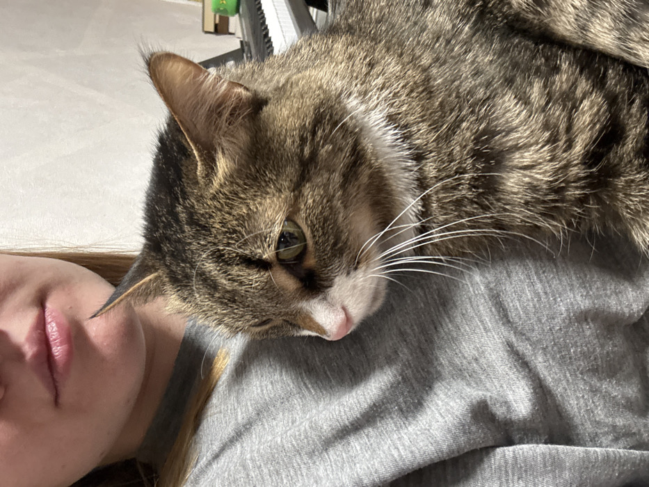 The image depicts an indoor residential setting. A human subject is partially visible on the left, showing the lower portion of their face, including the mouth and chin, and their left shoulder and upper chest, covered by a grey fabric garment. Positioned against the human is a domestic cat, exhibiting a tabby fur pattern in shades of brown, grey, and black, with a prominent white muzzle, a pink nose, and green eyes. The cat is wearing a thin white collar. Its head is oriented slightly to the left, away from the camera. In the background on the right, a white musical keyboard with black keys is partially visible, alongside a small green object. The specific location within the city of Krasny Klyuch, Russia, cannot be determined from the visual information provided.