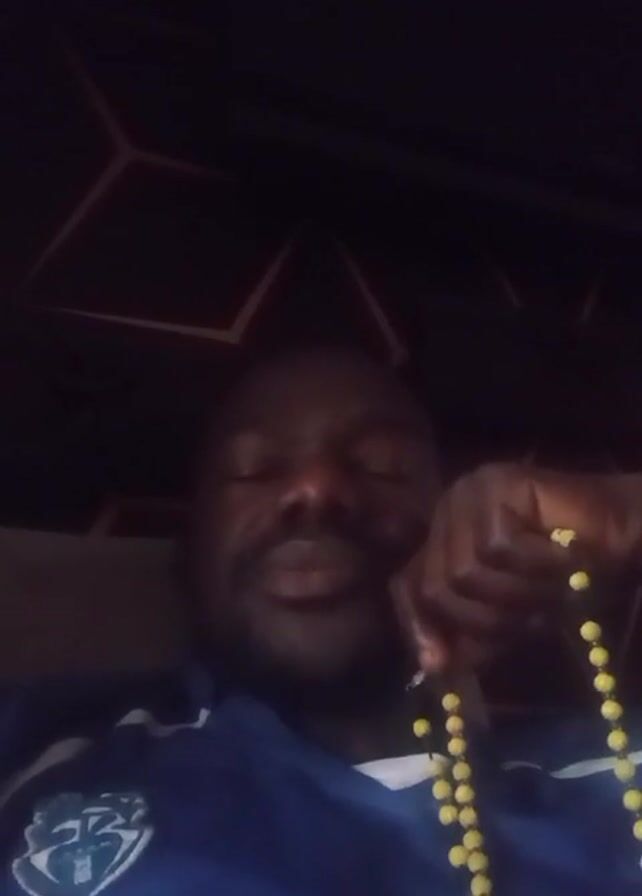 A man is holding a string of yellow beads. He is wearing a blue shirt with a patch on it. The background is dark with some geometric shapes on the ceiling.