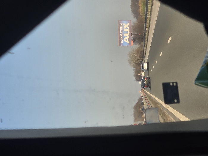 The image presents a daytime view from inside a vehicle, looking forward through a smudged windshield onto a multi-lane highway. Dark framing from the vehicle's interior partially obstructs the left, top-right, and bottom-right sections of the frame. The sky is clear and blue. The highway is asphalt, featuring at least two lanes of travel in the depicted direction, separated by dashed white lines. A solid white line borders the right shoulder. A central median barrier, composed of a metal guardrail atop a raised strip, separates the opposing lanes of traffic. Several vehicles are visible ahead on the highway. A dark-colored sedan is in the left lane, followed by a white car in the right lane further ahead. Other vehicles are present in the distance. On the right side of the highway, beyond a metal guardrail, a large billboard is erected on two poles. The billboard displays text in Bulgarian: "КЛИМАТИЦИ" (Air Conditioners) in white on a blue background, with "AUX" in large white letters on a red-to-blue gradient below it. The surrounding environment features bare deciduous trees and shrubs, indicative of late winter or early spring, extending into a field or open area. Similar bare trees are visible beyond the median on the left. Within the camera vehicle's interior, a small, black, rectangular object with four circular perforations (two top, two bottom) is visible on the windshield, possibly an attachment or sensor. A green object, possibly part of packaging, is partially visible in the bottom-right corner. The scene is located on a highway in or around Trilistnik, Plovdiv Province, Bulgaria.