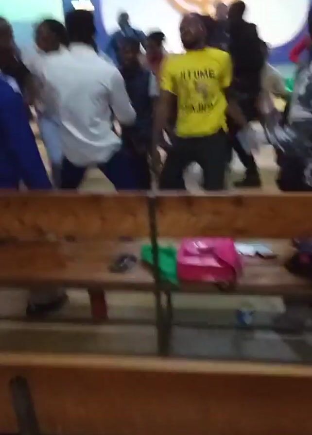 A group of people are dancing in a room. The room appears to be a church or auditorium with a lit cross and a menorah-like structure visible on a stage in the background. The dancers are moving enthusiastically. Some are wearing casual clothing, including one person in a yellow t-shirt. A wooden bench is in the foreground, with various items like a pink bag, a phone, and some clothing resting on it. The camera appears to be handheld and unsteady, capturing the scene from behind the bench.