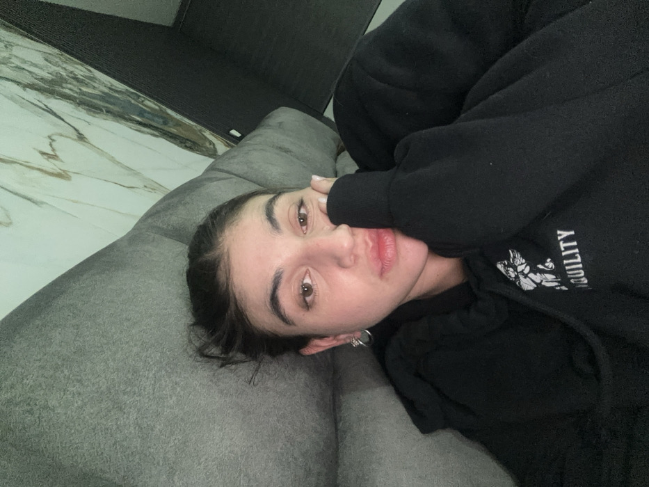 A young woman with brown eyes and dark hair lies on a gray couch, facing the camera. She wears a black hoodie with a graphic design and the word "Tranquility" on the sleeve. Her right hand rests against her cheek. The background features a textured wall or floor with light marble patterns and a dark gray panel. The photo is taken at a slightly angled perspective.