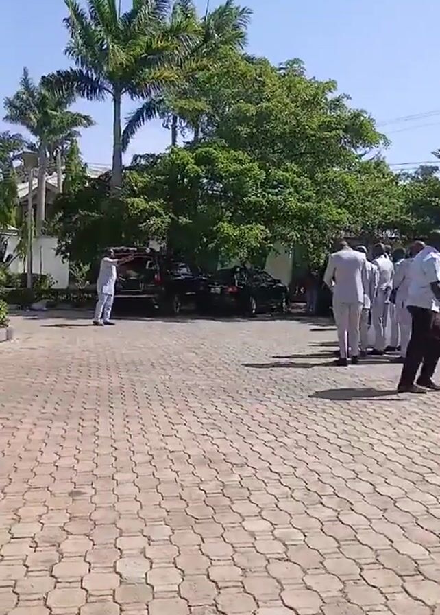 Certainly! Here's a concise description of the video: The video shows a group of men dressed in white suits standing on a paved area lined with trees and palm trees. Some black SUVs are parked nearby. One man in a white tunic seems to be giving instructions or directions, gesturing towards one of the vehicles. The overall atmosphere appears formal, possibly related to an official event or gathering. The weather appears sunny with a clear blue sky.