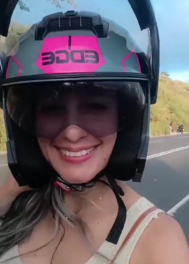 A young woman wearing a beige tank top and a grey and pink motorcycle helmet is riding on the back of a motorcycle on a paved road. The helmet has the word "EDGE" written on it in pink letters. She is smiling and looking at the camera. The road is lined with trees and hills. The driver of the motorcycle, a man with dark hair, is wearing a green shirt and a similar helmet. The motorcycle is moving on the road.