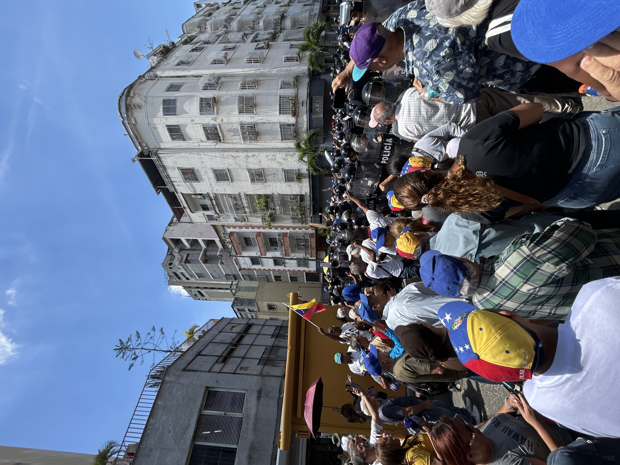 A street scene in Caracas, Venezuela, shows a crowd of civilians facing a line of police in riot gear