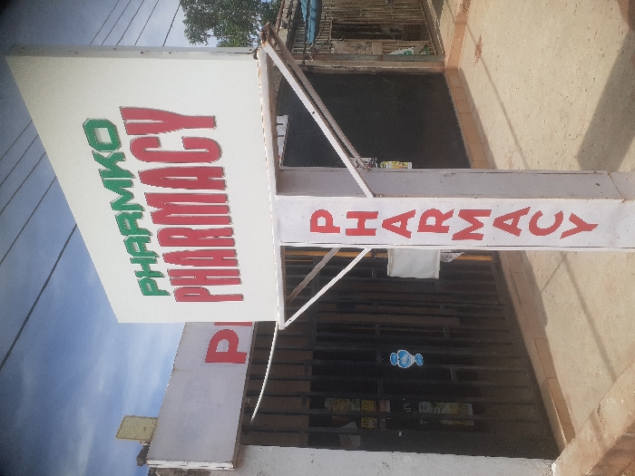 The scene depicts the exterior of "PHARMKO PHARMACY" in Gura Top, Nigeria