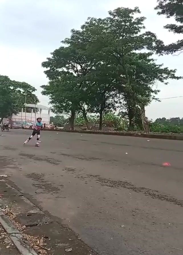 A young person, wearing a helmet, knee pads, and light-up pink roller skates, is seen in motion on a paved road. They are skating toward a group of people gathered on a curb. The road is cracked and has patches of discoloration. There are trees lining the edge of the road, and small cones are placed on the pavement. The sky is overcast.