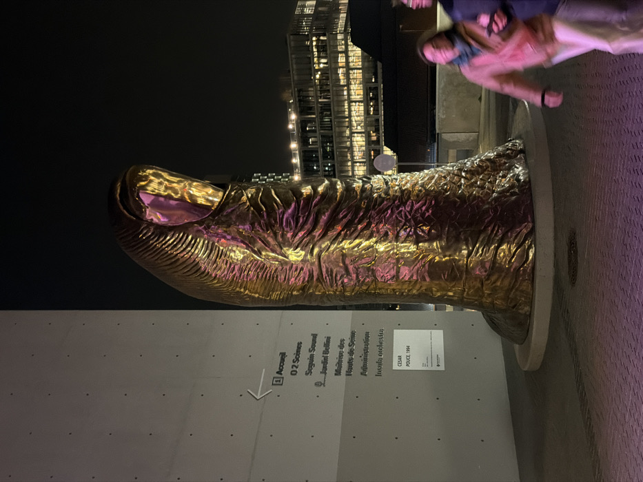 The image depicts an urban outdoor scene at night in Boulogne-Billancourt, France. A large, golden, textured sculpture of a human thumb, identified by a plaque as "CESAR POUCE, 1994", stands centrally on a circular base on a patterned, purple-lit pavement. To the left of the sculpture, a grey wall displays white text indicating directions to "Accueil", "O2 Scènes", "Seguin Sound", "Jardin Bellini", "Maîtrise des Hauts-de-Seine", "Administration", and "Insula orchestra". In the background, under a dark sky, modern buildings with numerous illuminated windows are visible. Two blurred individuals are in motion on the right side of the foreground, walking past the sculpture. One person, wearing a light brown jacket and light blue scarf, has their head turned towards the left. A second person is partially obscured behind them, holding a dark object, likely a phone. Artificial lighting casts golden, pink, and purple reflections on the sculpture's surface.