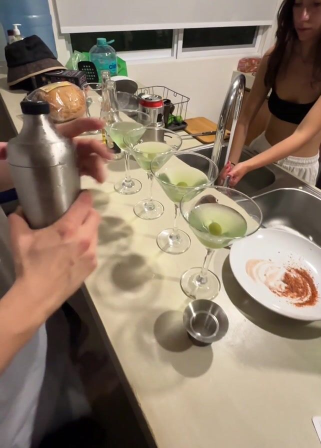 person making cocktails in a kitchen. Four martini glasses filled with a green liquid and an olive are lined up on a counter. A person holds a metal cocktail shaker and begins to shake it. In the background, a young woman in a black bra top and light-colored shorts stands at the kitchen sink with water running. Another woman with her back to the camera is further back in the kitchen, near the stove. The kitchen counter also holds a large bottle of water, a loaf of bread, a green bottle, and other small objects. A white plate with red spice on it sits beside the glasses.