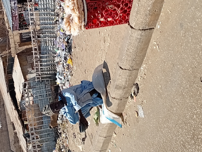 The image depicts an outdoor street scene in Dorayi, Nigeria. In the foreground, a paved asphalt road extends into the lower third of the frame, bordered by a weathered, cracked concrete curb. Squatting on the dirt ground immediately behind the curb is an adult male, appearing middle-aged or elderly. He wears a light blue long-sleeved tunic (kaftan) and matching trousers, topped with a patterned cap. His left hand holds a dark, empty bowl, while his right hand rests on his right knee. He looks directly forward. Adjacent to the man, on the dirt ground behind the curb, are a pair of light green open-toed slippers and a white and blue striped fabric or bag. To the right of the man, a red plastic crate, positioned on its side, supports a stack of several round, light-colored food items, resembling fried dough or flatbreads. The midground and background reveal an extensive unmaintained area heavily covered with assorted refuse, including numerous plastic bags, paper, and various discarded materials. Behind this debris field, a metal fence, constructed from grates and corrugated sheets, runs horizontally. Beyond the fence, several single-story structures with corrugated metal roofs are visible, appearing to be commercial shops and residences. One shop displays shoes and sandals. A light brown goat is partially visible amidst the debris behind the fence. The scene is illuminated by direct sunlight, casting clear shadows.