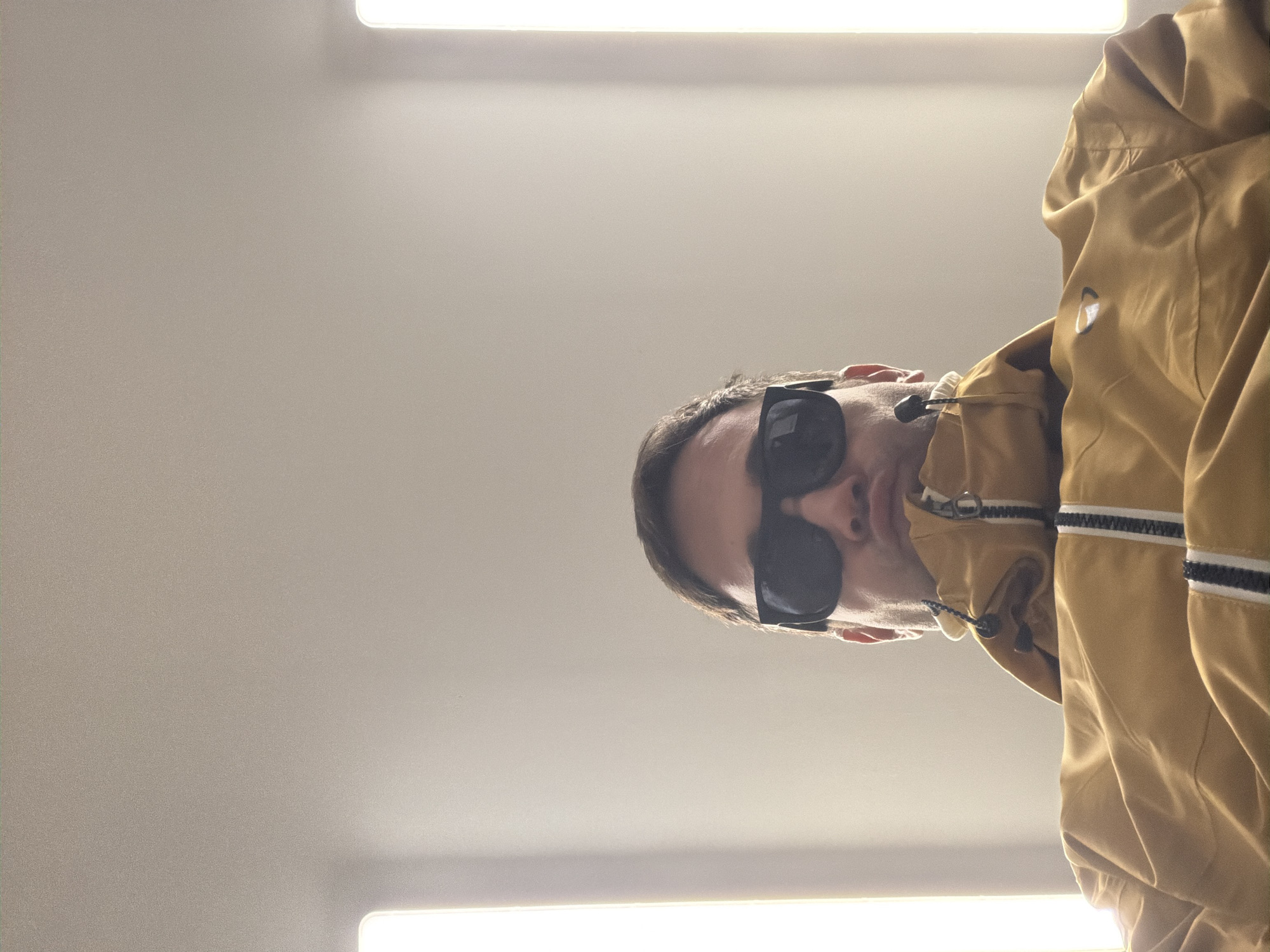 The scene depicts a male individual captured from a low-angle perspective within a building in Pétange, Luxembourg. The subject, positioned in the lower half of the frame, wears dark, rectangular sunglasses that obscure his eyes. He has short, dark hair and a neutral facial expression with his lips slightly pursed. He is dressed in a mustard yellow jacket featuring a full front zipper with a black and white striped pull tab. The jacket's collar is visible, along with black drawstring toggles near the neckline. A small, light-colored circular emblem is present on the upper left chest area of the jacket. The background consists of a plain, light-colored surface, likely an interior wall or ceiling. Two vertical, illuminated light sources, consistent with fluorescent tubes or LED panels, are visible on either side of the subject, indicating an artificial indoor lighting environment. No direct actions or interactions beyond posing for the photograph are discernible.