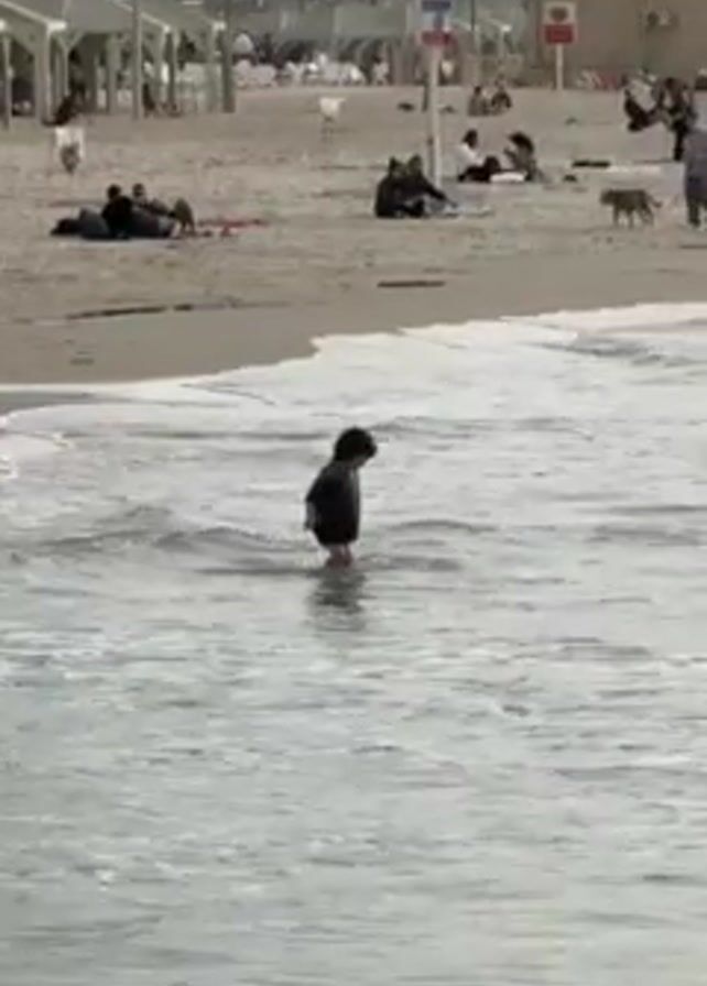 young child standing in shallow water near a beach. The child is wearing dark clothing and has curly hair. Several people are visible on the sandy beach, some relaxing under shade structures, others walking. There is a dog on the beach, too. Buildings can be seen in the background. The water is choppy with small waves.