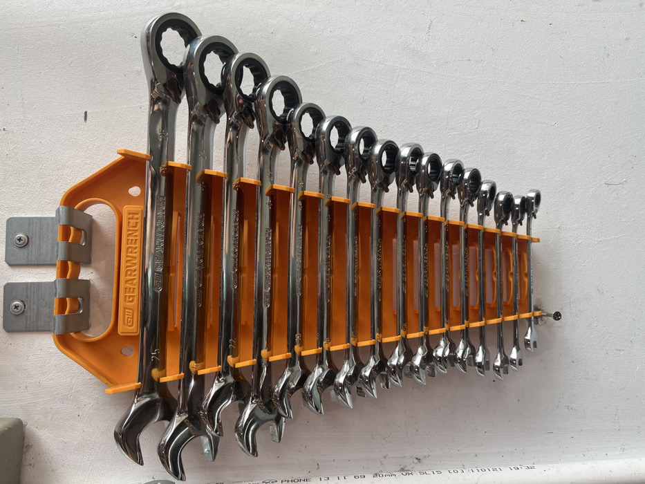 A set of Gearwrench combination ratcheting wrenches hangs on an orange plastic holder mounted to a white wall