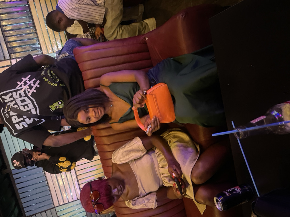 Several people are seated on a red leather couch. A woman in a green dress holds an orange purse, and another woman with red hair wears sunglasses. A man in a black t-shirt and cap is also present. Empty bottles and a beer can are placed on a table beside the couch. Other individuals are seen in the background. The setting appears to be a lounge or social gathering.