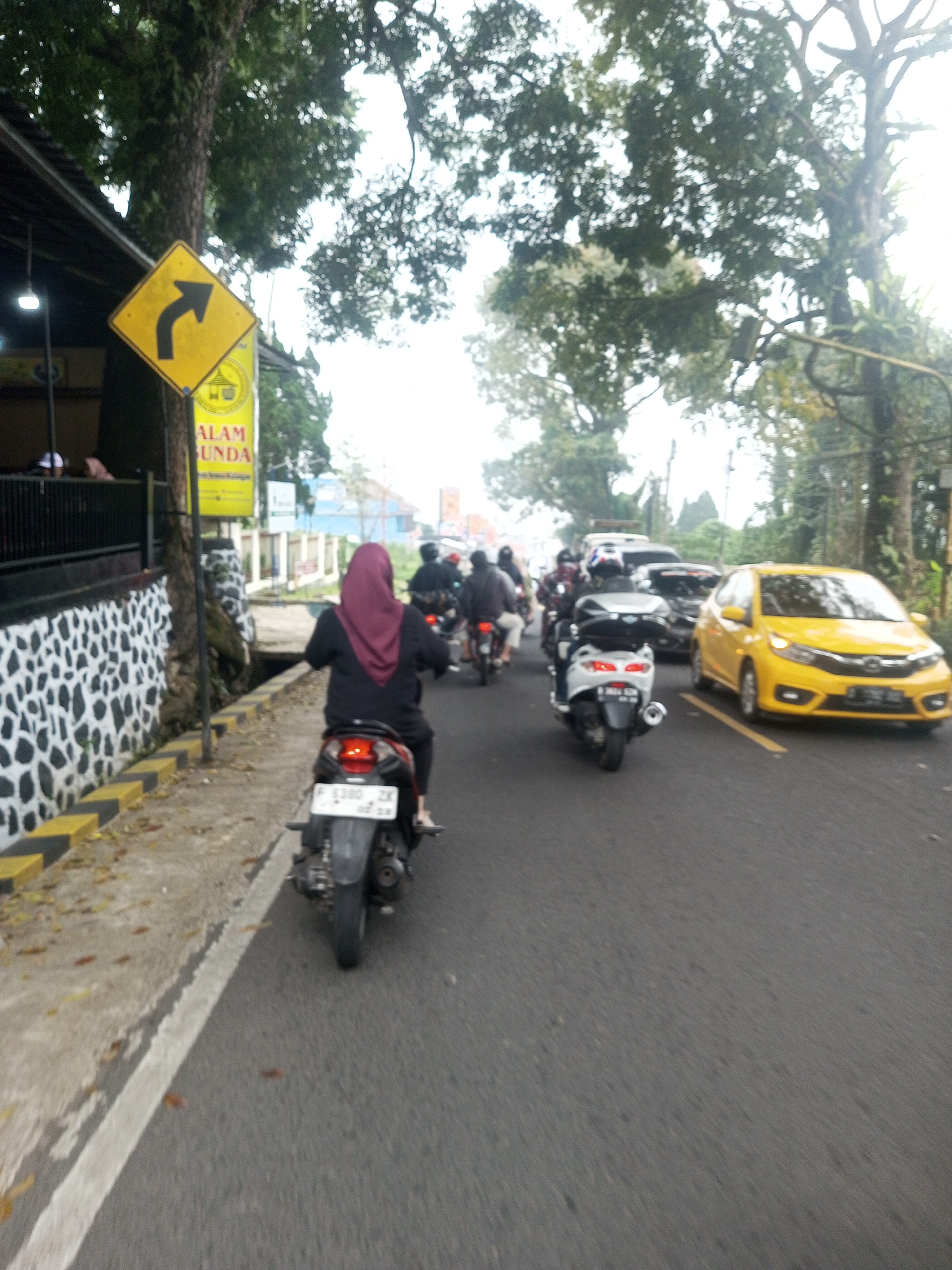 The scene depicts a street in Houaythat, Laos, under an overcast sky. In the foreground, the rear of a black scooter with license plate F 1380 ZK is visible, driven by an individual wearing a burgundy hijab and a dark long-sleeved top. The scooter is positioned on the right side of a paved road, which features a solid white line marking the shoulder and a broken yellow center line. To the left of the road, a sidewalk with yellow and black striped curbs adjoins a stone wall featuring an irregular black and white pattern. Adjacent to the wall, a large tree trunk stands next to a building with a dark roof, where illuminated lights and partially visible individuals are present within an open seating area. Attached to the tree is a yellow diamond-shaped road sign indicating a sharp right curve, with a partially visible rectangular yellow sign beneath it displaying the text "ALAM SUNDA". Ahead of the foreground scooter, multiple motorcycles, some carrying helmeted riders, are in motion or stopped in traffic. A bright yellow Honda Brio sedan is visible to the right, also in traffic, facing the viewer. Further down the street, additional vehicles, including a white scooter and dark-colored cars, are present. Dense green foliage from numerous trees lines both sides of the road, particularly in the background.