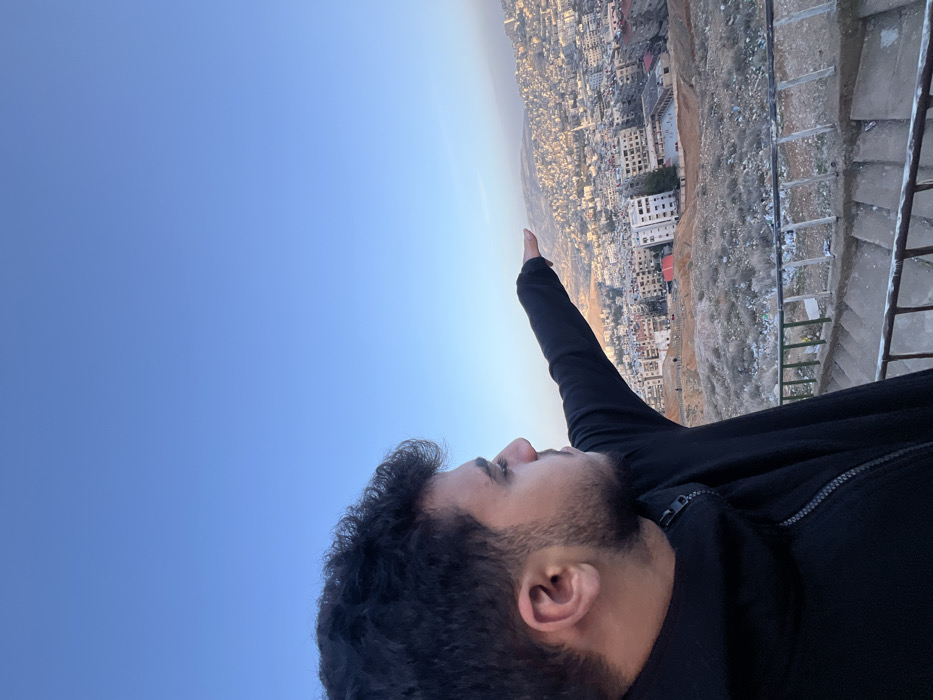 An outdoor photograph depicts a young male in the foreground, positioned on a hillside overlooking the city of Qudsaiya, Syria