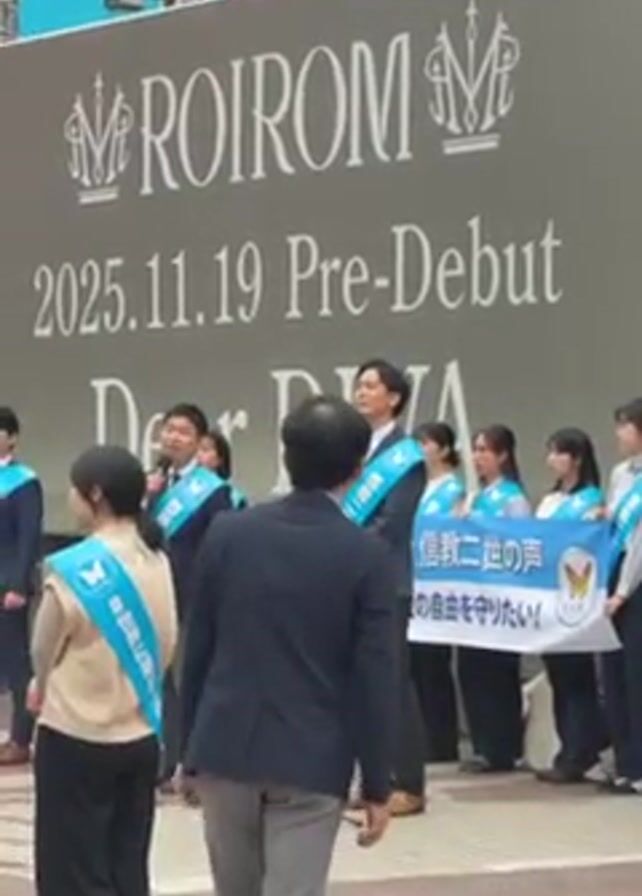 A group of Japanese people are standing in front of a gray sign with the text “ROIROIM” and “2025.11.19 Pre-Debut Dear DIVA” on it. They are wearing sashes with Japanese characters and holding a banner that reads “信教二世の声 信仰の自由を守りたい!” They are speaking to the public. A man in a beanie walks in front of them.