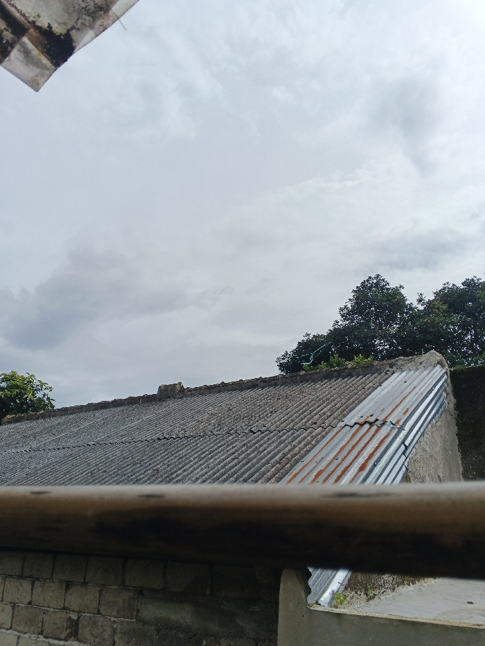 A view from an elevated position shows a gray, cloudy sky above a dilapidated roof with corrugated sheets