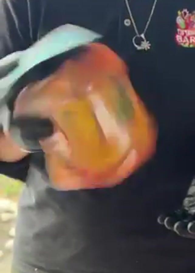 A person in black gloves is shaking a large, transparent plastic container with an orange substance inside. The container has a green label and a dark lid. The person is wearing a black polo shirt with a logo on the right breast and a silver necklace. The background appears to be a window or glass partition, with some greenery visible outside. The person is holding the container with both hands, shaking it vigorously.