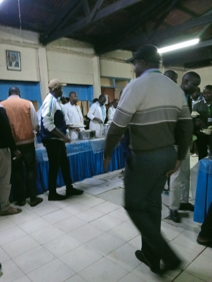 In a brightly lit interior, several people are lined up at a table draped with a blue cloth. Some individuals appear to be serving food from metal containers on the table. A man in a black cap and grey sweater is walking towards the right of the frame. The floor is tiled, and a picture hangs on the wall in the background. It seems to be a gathering or event where food is being served.