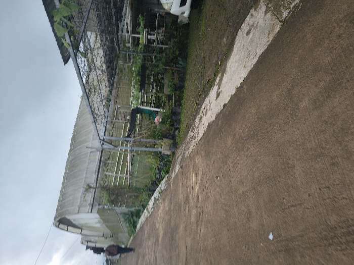 The image depicts an outdoor scene in An Khe Ward, Vietnam, under an overcast sky. A wide, dark brown, textured concrete or dirt pathway slopes uphill from the foreground towards the background on the left. A narrower, lighter gray concrete strip borders the pathway on its right side. On the right, adjacent to the pathway, a commercial plant nursery or agricultural facility is visible. It features a large, arched-roof greenhouse with a translucent white covering and metal framing, extending into the midground. Behind this, a second similar greenhouse structure is partially visible. To the right of the main greenhouse, an open-air metal-framed structure with a dark mesh or netting overhead functions as a shade structure. Within this area and alongside the greenhouse, numerous plants are arranged in black plastic pots, some on elevated shelves. One distinct pink flower is visible among the potted plants. Further right, a partial view of a building with a gray roof and the front portion of a white vehicle are present. A single individual, wearing a dark jacket and light trousers, walks uphill on the left side of the pathway, moving away from the viewer. A small piece of white debris is visible on the pathway in the lower-left foreground.