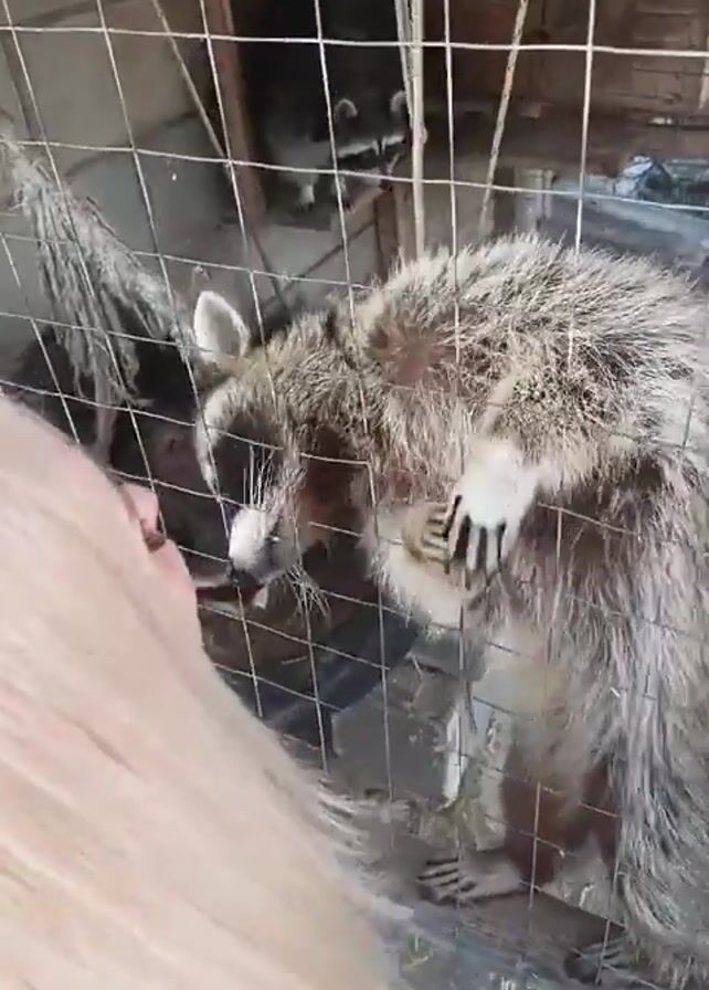 - "A person with long blond hair is interacting with a raccoon in a wire cage" by FM-YVp303, licensed under CC BY 4.0