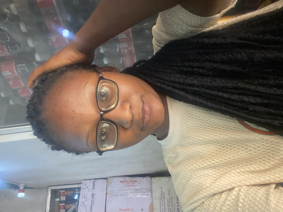 A person wearing glasses and a white patterned top poses for a selfie. Their dark hair is styled in braids. They are indoors, with shelves stocked with beverages behind them. Below are stacked cardboard boxes displaying text like "IMPULSE" and "Omeprazole Omehil-20." A small light fixture is visible. The lighting is somewhat dim, creating a casual, candid atmosphere.
