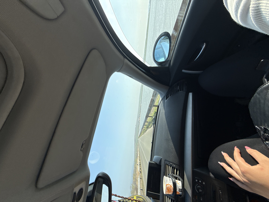 The image depicts the interior of a vehicle, viewed from the front passenger side, looking forward through the windshield