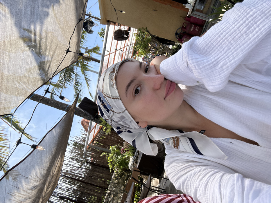 This image depicts an outdoor scene in Bunga Mekar, Indonesia, under bright daylight. The primary subject is a female individual positioned in the foreground, facing the camera with her head tilted slightly to the right and her left hand supporting her chin. She has light skin and is wearing a white, textured, long-sleeved garment and a white headscarf patterned with blue, white, and gold chains. Her expression is relaxed, with a faint smile. A partial view of another individual in a red and white striped garment is visible to the far left. The background features an outdoor seating area with wooden tables and chairs, a stone wall, and a bamboo screen. Overhead, a dark mesh shade canopy is strung with multiple incandescent bulbs. Through gaps in the canopy, a clear blue sky and several palm trees are visible. In the mid-ground, a light-colored building structure and a red-tiled roof are discernible. To the right, two red gas cylinders are visible near the building.