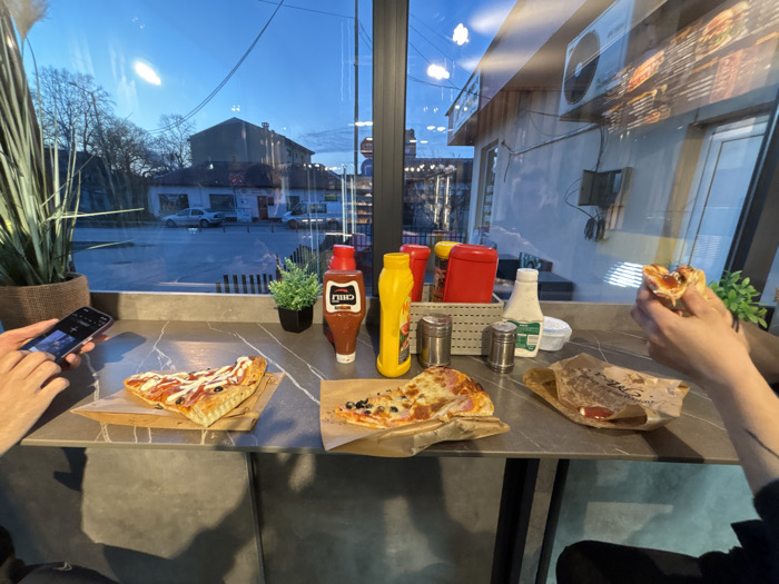 The scene depicts the interior of a casual dining establishment in Sevlievo, Bulgaria, looking outwards through a large glass window onto a street at dusk. Two individuals are seated at a dark gray, marled countertop, consuming food. On the left, one person holds a black smartphone in their left hand, with their right thumb interacting with the screen. To their right, a large slice of pizza topped with white sauce and black olives rests on parchment paper in a cardboard tray. A second slice of pizza with cheese, olives, and possible ham is positioned further right. A red "CHILI" branded sauce bottle, a yellow mustard bottle, and a white bottle of dressing are centrally located on the counter. A white basket contains two stainless steel shakers. On the right side of the frame, a second person holds a wrapped food item, possibly a burrito or similar, in both hands, taking a bite. Red sauce is visible inside the wrapper. Artificial potted plants are positioned on the counter as decor. Through the window, a street scene is visible under a deep blue, twilight sky. Across the street, a multi-story building with a light facade and a smaller, white-fronted building are discernible. Two light-colored cars are parked on the street. Deciduous trees, currently without leaves, line the thoroughfare. Reflections of an exterior air conditioning unit and a menu board are visible on the window's surface.