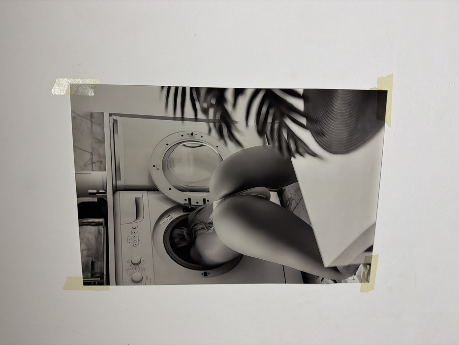 A black and white photograph is taped to a white wall. The photo depicts a person partially inside a front-loading washing machine. A second washing machine is stacked above. The person's lower body is visible, with their head and shoulders inside the lower washing machine. A palm tree and what appears to be a hat are partially visible in the background.