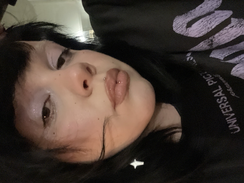 A person with dark hair and pale skin gazes at the camera. She has fair skin and light purple eye makeup, as well as a labret piercing. She appears to be wearing a black sweatshirt with a printed design, "UNIVERSAL PICTURES". Her hair is short, with blunt bangs across her forehead. A star-shaped earring is visible near her hairline. The image is closely cropped, focusing on the face and upper part of the body.