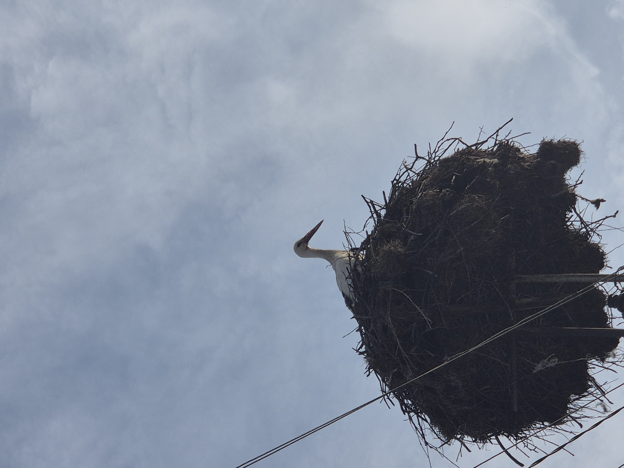 - "A low-angle shot depicts a stork nestled in its substantial nest, perched atop a utility pole in Mechkarevo, Bulgaria" by FM-slMcm2, licensed under CC BY 4.0