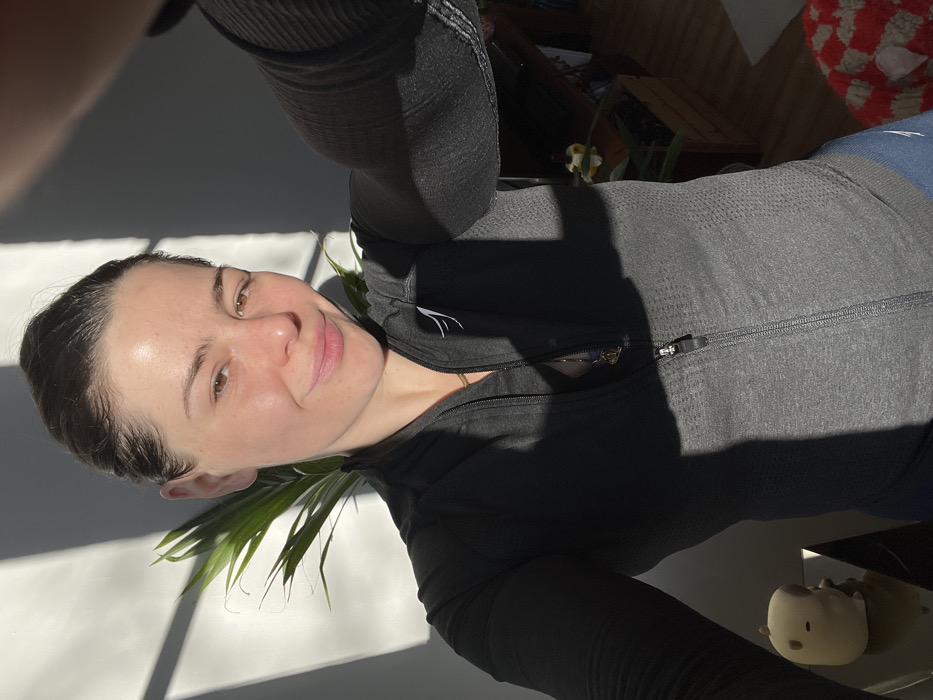 A Caucasian female subject is depicted in a close-up, chest-up selfie-style photograph taken indoors in Roubaix, France. She possesses dark brown hair, pulled back, and light brown eyes. Her face is illuminated by direct sunlight from the upper left, casting a sharp shadow across her right cheek and chin. She is wearing a dark grey, long-sleeved athletic top with a partial zip-front closure, featuring a subtle textured pattern and a white logo on the left chest. A thin gold chain necklace with a small pendant is visible. A green-leafed plant is positioned behind her left shoulder. Strong sunlight creates distinct shadows on the white wall in the background, including geometric patterns suggestive of a window frame. To the lower left, a cream-colored, animal-shaped figure with dark eyes rests on a reflective dark surface. Portions of a wooden floor and a reddish-brown, possibly knitted, textile object are visible in the blurred background to the right.
