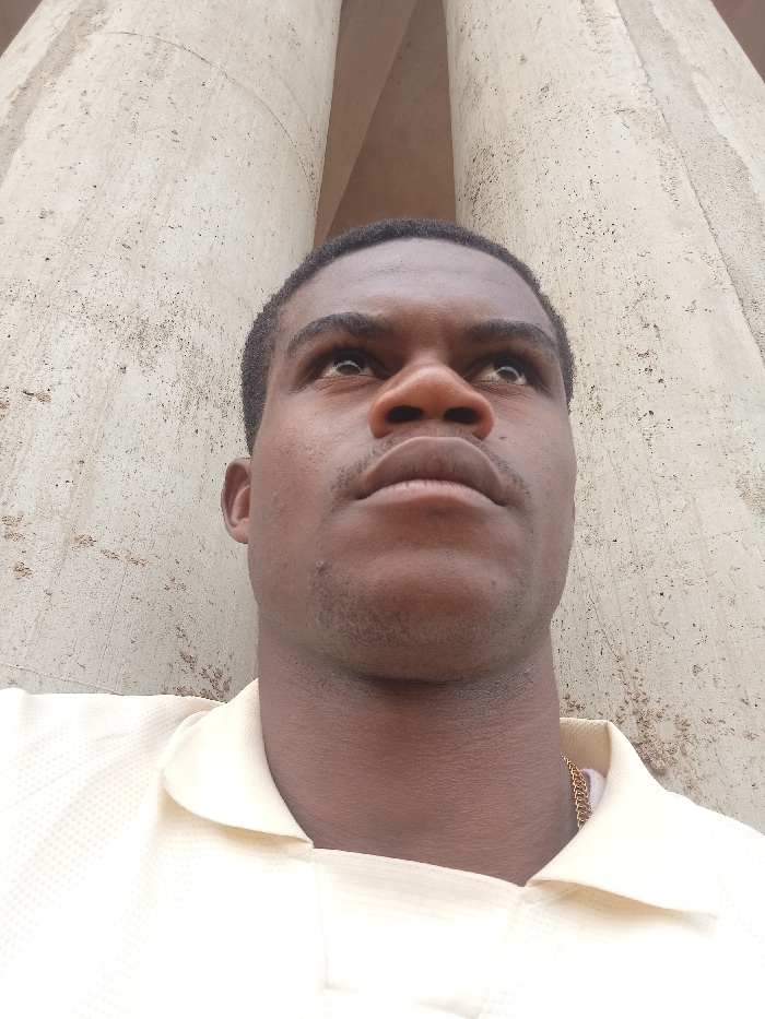 A low-angle, headshot-style image depicts a young adult male, appearing to be of African descent, looking upwards and slightly to the right. He has dark skin, short black hair, and faint stubble on his chin and upper lip. He is wearing a light cream or yellow polo shirt with a textured pattern, and a gold-colored chain is visible around his neck under the collar. The background consists of two large, light-grey concrete pillars or columns with a rough, weathered surface, extending vertically behind and above the subject. The scene is located in Onitsha, Nigeria.