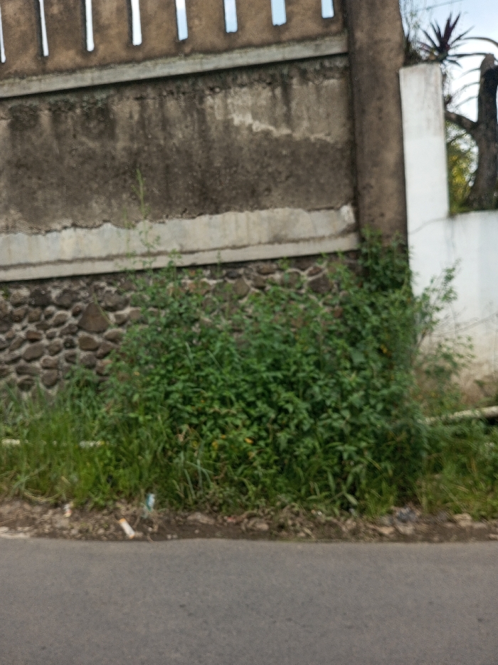 The image depicts a static, outdoor scene at what is identified as Vieng Phouka, Laos, focusing on a section of a roadside wall and its immediate surroundings. The foreground features a grey asphalt road, slightly blurred. Immediately above the road, a narrow strip of dirt and sparse ground cover contains scattered litter, including a white, elongated object. Behind this, dense green vegetation, comprising bushes and tall grasses, obstructs the lower portion of a wall structure. The wall consists of a dark stone foundation made of irregular, rounded rocks, topped by a weathered, grey concrete section. This concrete section exhibits dark staining and lighter horizontal bands. The uppermost part of the concrete wall is darker and features several evenly spaced, vertical rectangular apertures, through which a light sky is visible. To the right, a thick, dark cylindrical post stands vertically, marking a transition point to a clean white wall, partially visible behind the post. Further to the right and above the white wall, dark tree branches and spiky foliage are present against the sky. No individuals, actions, or interactions are visible within the frame. The overall environment appears to be an unkempt roadside area adjacent to a property boundary.