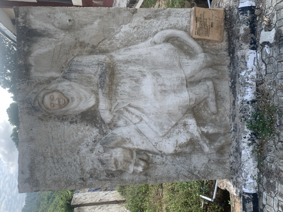 A weathered, grey concrete bas-relief sculpture stands prominently in Lokoja, Nigeria, depicting a woman in flowing garments and a headscarf, riding a horse that faces left