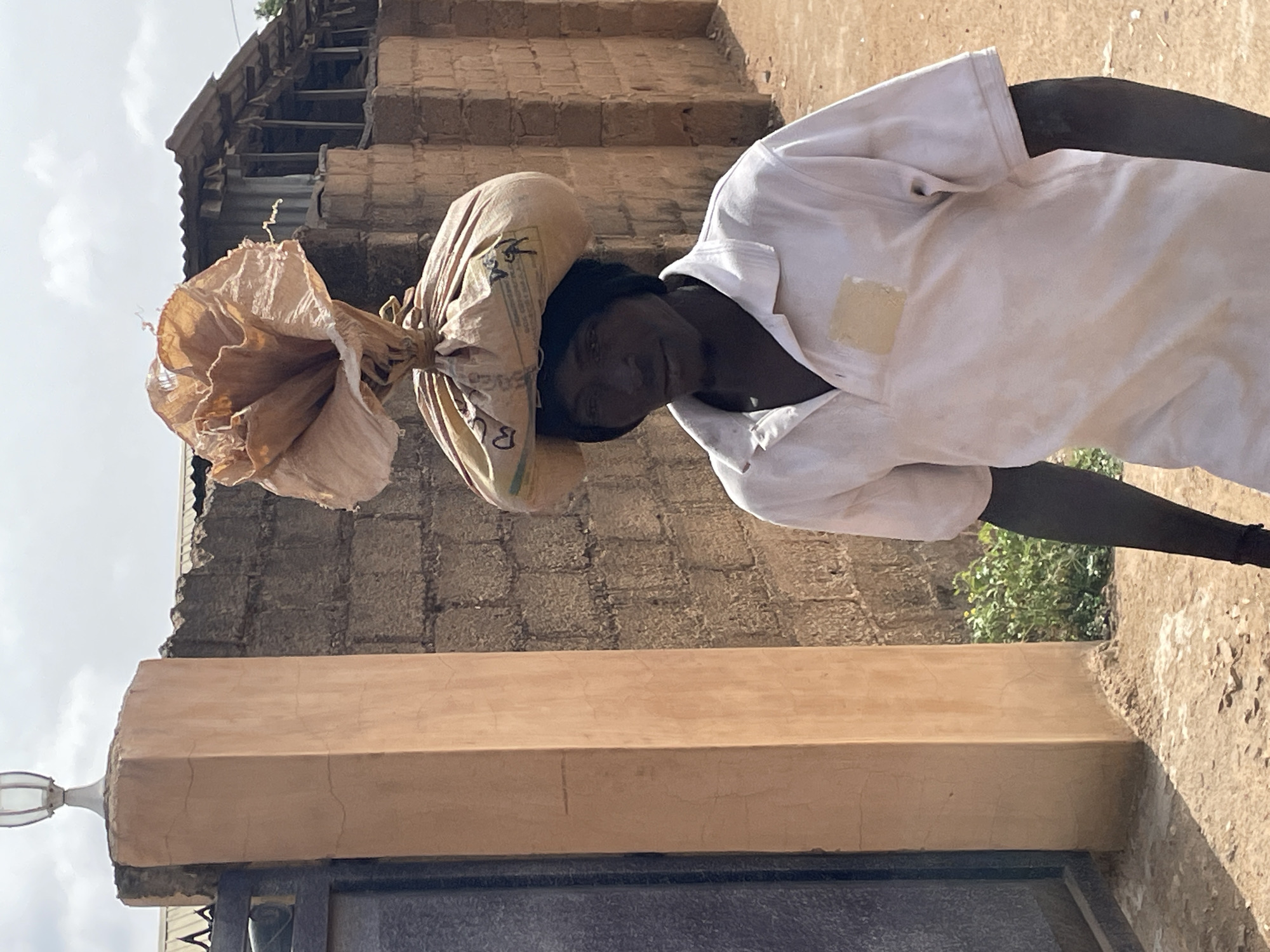 A person with dark skin carries a large sack on their head in Jos, Nigeria. The person wears a white shirt and dark pants. The sack appears to contain dried goods or plants, with some protruding from the top. The background features a brick wall and a structure with a damaged or unfinished roof. The scene is outdoors during daylight hours, with a gate and fence visible in the foreground.